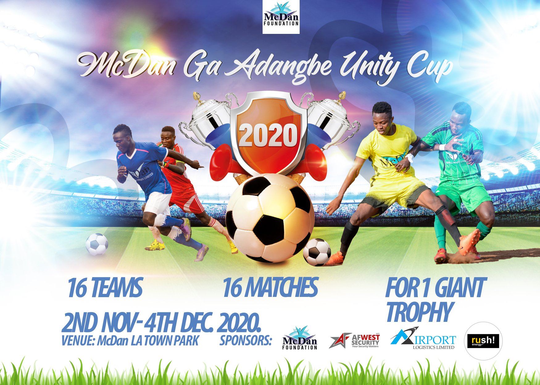 2nd Nov – 4th Dec. 2020. McDan La Town Park. Come let’s watch and enjoy beautiful dribbles, amazing goals, sublime headers and formidable attacks #McDanUnityCup